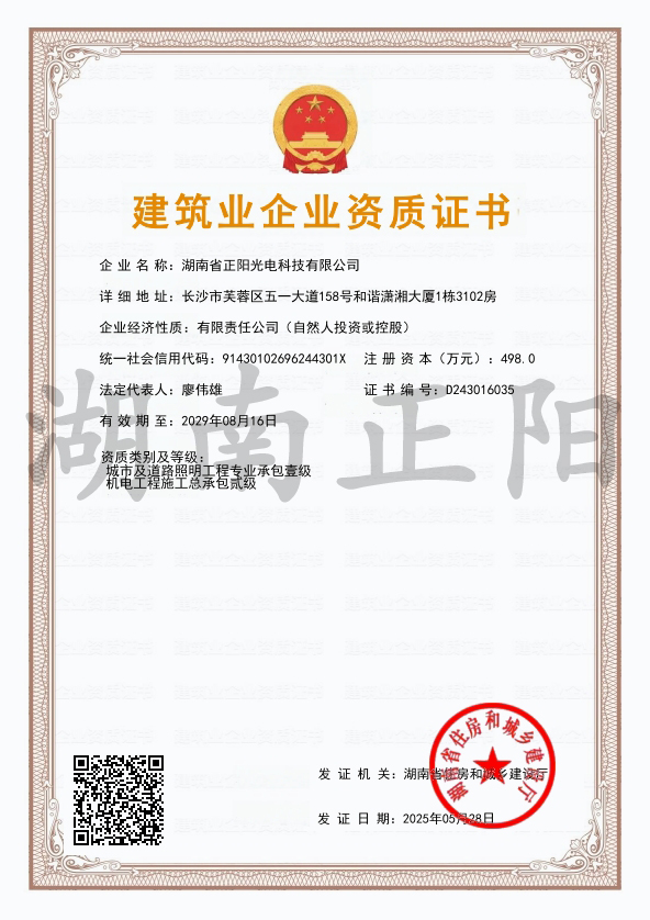 2025年5月28日,經湖南省住房和城鄉建設廳審核批準,湖南省正陽光電科技有限公司成功獲得“機電工程施工...